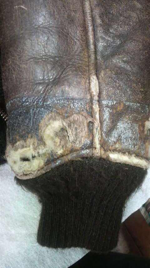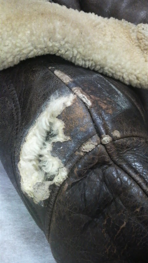 肩と袖口部分が擦り切れたムートン製ジャケットの革当て補修をしました。
