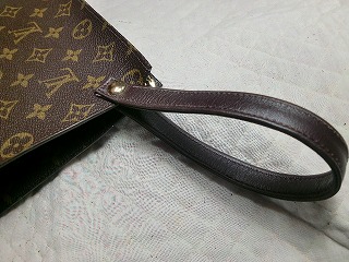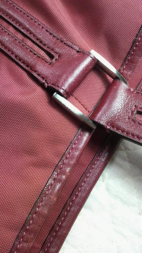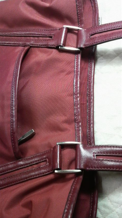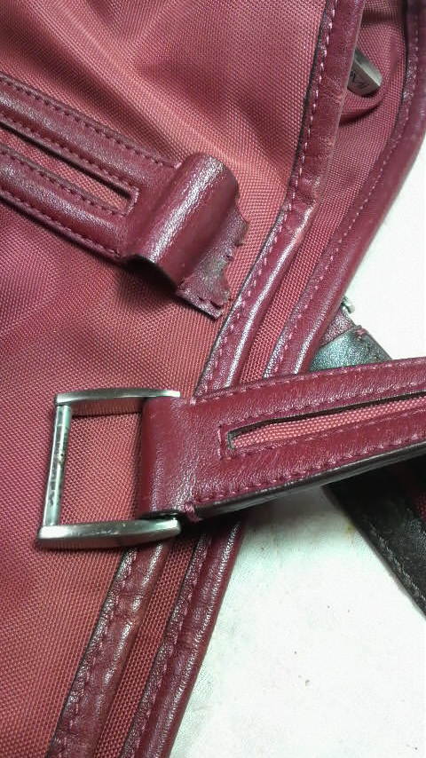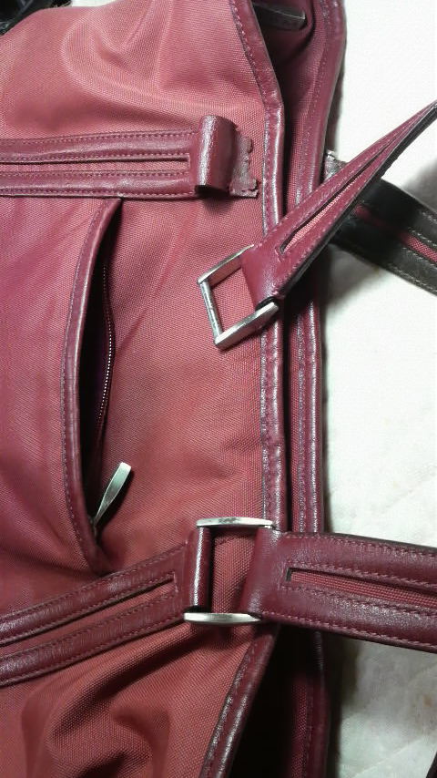 千切れてしまった革製の持ち手を革当てで補強後、修理しました。